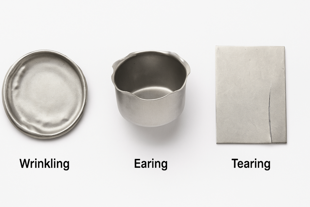 • Solutions: Reduce BHF, apply proper lubrication, increase punch/die radii, and verify material ductility meets required strain energy.